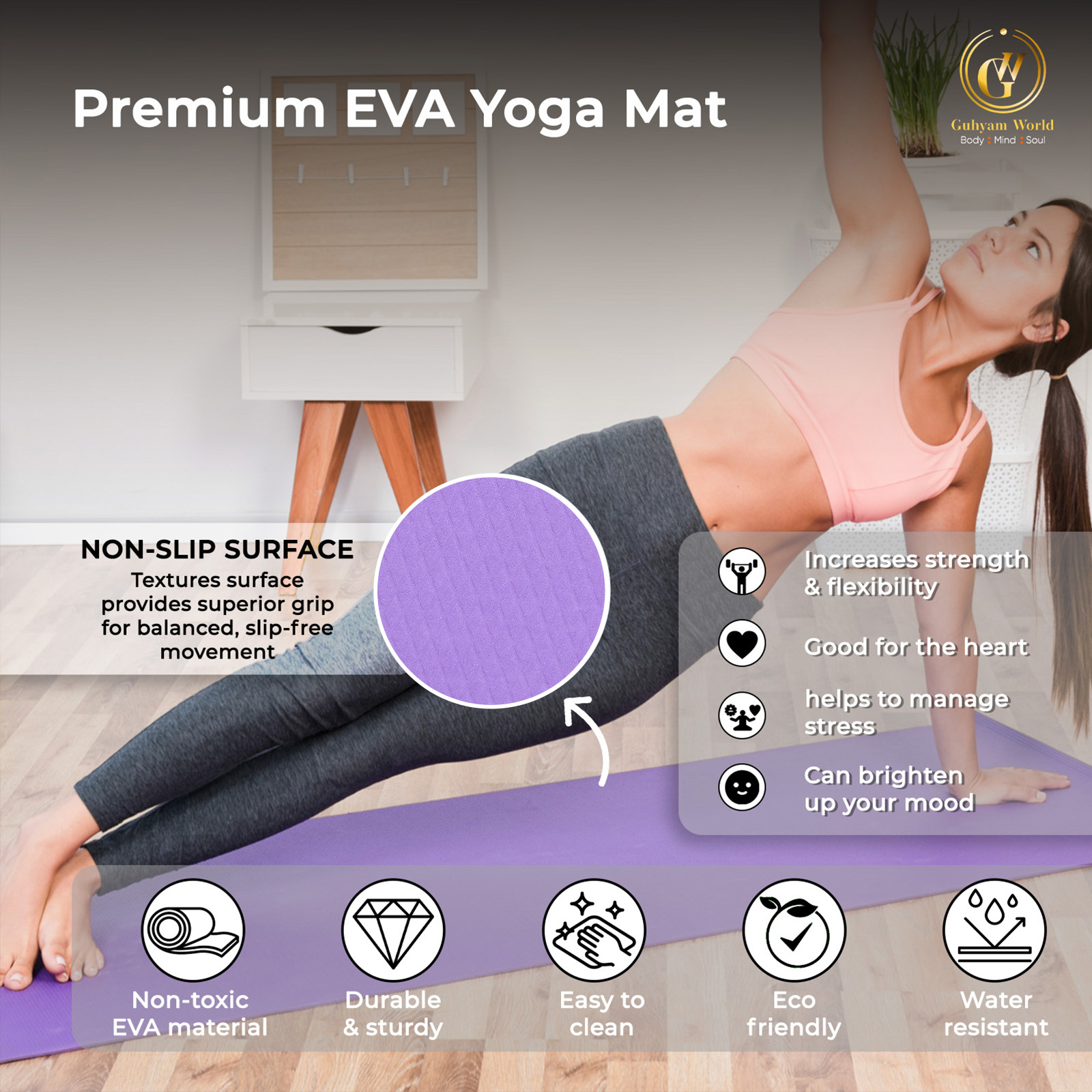 Guhyam World EVA Anti-Skid Yoga Mat | Sweat-Resistant | Durable Comfort